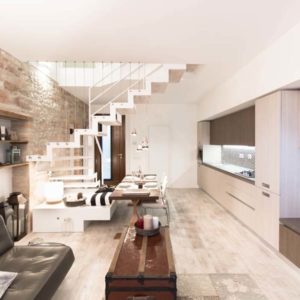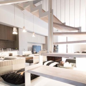 Notevole il volume dell’ambiente dovuto all’altezza del soffitto in travi di legno sbiancato.